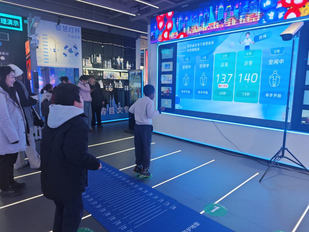 来到 AI 体育区,科技与运动碰撞出别样火花,同学们在 AI 姿态引导、趣味互动 PK 中快乐运动,在游戏化的体验里感受智能体育的魅力,让运动变得有趣又有料。