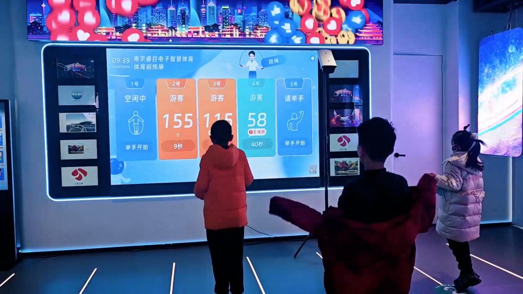 来到 AI 体育区,科技与运动碰撞出别样火花,同学们在 AI 姿态引导、趣味互动 PK 中快乐运动,在游戏化的体验里感受智能体育的魅力,让运动变得有趣又有料。